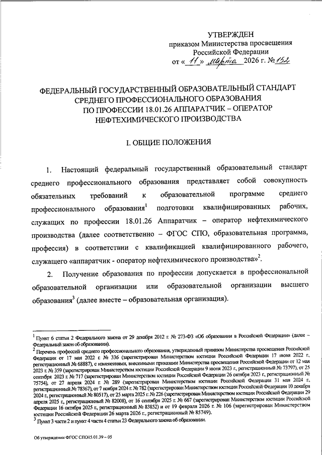 "ОБ УТВЕРЖДЕНИИ ФЕДЕРАЛЬНОГО ГОСУДАРСТВЕННОГО ОБРАЗОВАТЕЛЬНОГО СТАНДАРТА СРЕДНЕГО ПРОФЕССИОНАЛЬНОГО ОБРАЗОВАНИЯ ПО ПРОФЕССИИ 18.01.26 АППАРАТЧИК - ОПЕРАТОР НЕФТЕХИМИЧЕСКОГО ПРОИЗВОДСТВА"