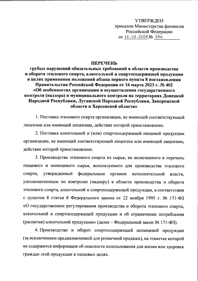 "ОБ УТВЕРЖДЕНИИ ПЕРЕЧНЯ ГРУБЫХ НАРУШЕНИЙ ОБЯЗАТЕЛЬНЫХ ТРЕБОВАНИЙ В ОБЛАСТИ ПРОИЗВОДСТВА И ОБОРОТА ЭТИЛОВОГО СПИРТА, АЛКОГОЛЬНОЙ И СПИРТОСОДЕРЖАЩЕЙ ПРОДУКЦИИ В ЦЕЛЯХ ПРИМЕНЕНИЯ ПОЛОЖЕНИЙ АБЗАЦА ПЕРВОГО ПУНКТА 8 ПОСТАНОВЛЕНИЯ ПРАВИТЕЛЬСТВА РОССИЙСКОЙ ФЕДЕРАЦИИ ОТ 16 МАРТА 2023 Г. N 402 "ОБ ОСОБЕННОСТЯХ ОРГАНИЗАЦИИ И ОСУЩЕСТВЛЕНИЯ ГОСУДАРСТВЕННОГО КОНТРОЛЯ (НАДЗОРА) И МУНИЦИПАЛЬНОГО КОНТРОЛЯ НА ТЕРРИТОРИЯХ ДОНЕЦКОЙ НАРОДНОЙ РЕСПУБЛИКИ, ЛУГАНСКОЙ НАРОДНОЙ РЕСПУБЛИКИ, ЗАПОРОЖСКОЙ ОБЛАСТИ И ХЕРСОНСКОЙ ОБЛАСТИ"