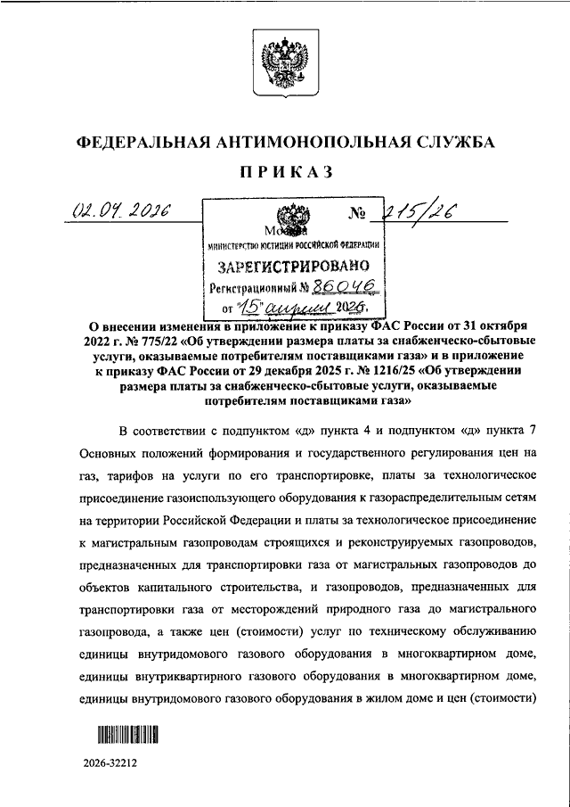 ПРИКАЗ Федеральной антимонопольной службы от 02.04.2026 N 215/26