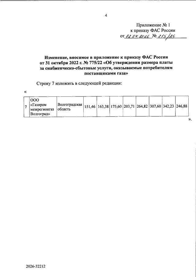 "О ВНЕСЕНИИ ИЗМЕНЕНИЯ В ПРИЛОЖЕНИЕ К ПРИКАЗУ ФАС РОССИИ ОТ 31 ОКТЯБРЯ 2022 Г. N 775/22 "ОБ УТВЕРЖДЕНИИ РАЗМЕРА ПЛАТЫ ЗА СНАБЖЕНЧЕСКО - СБЫТОВЫЕ УСЛУГИ, ОКАЗЫВАЕМЫЕ ПОТРЕБИТЕЛЯМ ПОСТАВЩИКАМИ ГАЗА" И В ПРИЛОЖЕНИЕ К ПРИКАЗУ ФАС РОССИИ ОТ 29 ДЕКАБРЯ 2025 Г. N 1216/25 "ОБ УТВЕРЖДЕНИИ РАЗМЕРА ПЛАТЫ ЗА СНАБЖЕНЧЕСКО - СБЫТОВЫЕ УСЛУГИ, ОКАЗЫВАЕМЫЕ ПОТРЕБИТЕЛЯМ ПОСТАВЩИКАМИ ГАЗА"