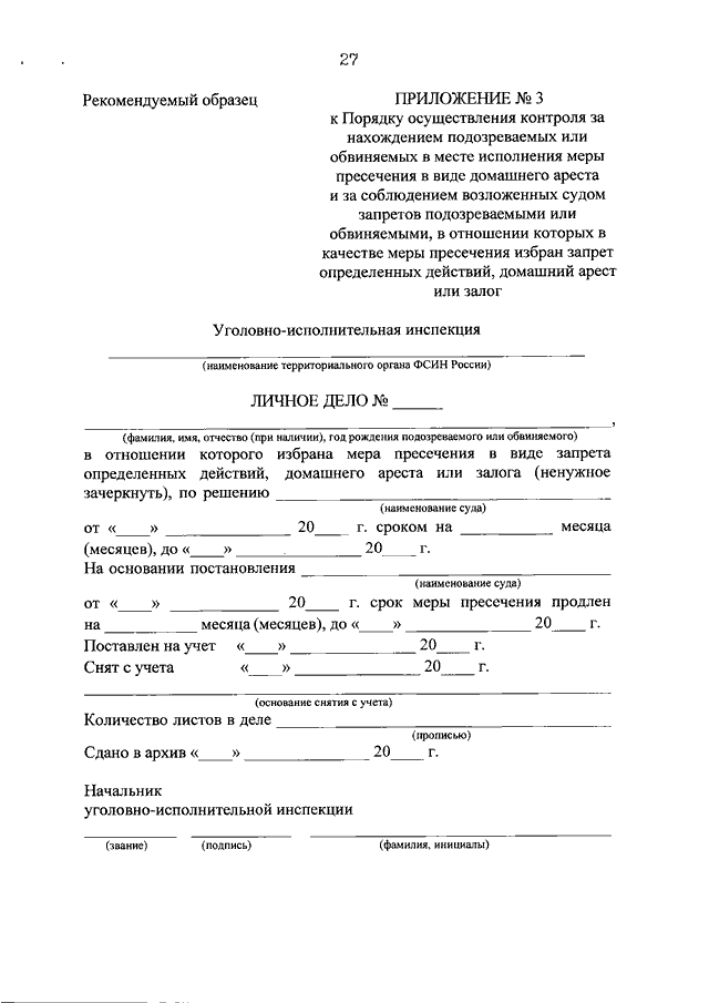 "ОБ УТВЕРЖДЕНИИ ПОРЯДКА ОСУЩЕСТВЛЕНИЯ КОНТРОЛЯ ЗА НАХОЖДЕНИЕМ ПОДОЗРЕВАЕМЫХ ИЛИ ОБВИНЯЕМЫХ В МЕСТЕ ИСПОЛНЕНИЯ МЕРЫ ПРЕСЕЧЕНИЯ В ВИДЕ ДОМАШНЕГО АРЕСТА И ЗА СОБЛЮДЕНИЕМ ВОЗЛОЖЕННЫХ СУДОМ ЗАПРЕТОВ ПОДОЗРЕВАЕМЫМИ ИЛИ ОБВИНЯЕМЫМИ, В ОТНОШЕНИИ КОТОРЫХ В КАЧЕСТВЕ МЕРЫ ПРЕСЕЧЕНИЯ ИЗБРАН ЗАПРЕТ ОПРЕДЕЛЕННЫХ ДЕЙСТВИЙ, ДОМАШНИЙ АРЕСТ ИЛИ ЗАЛОГ"