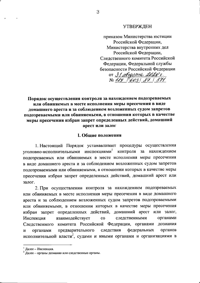 ПРИКАЗ Минюста РФ N 189, МВД РФ N 603, Следственного комитета РФ N 87, ФСБ РФ N 371 от 31.08.2020