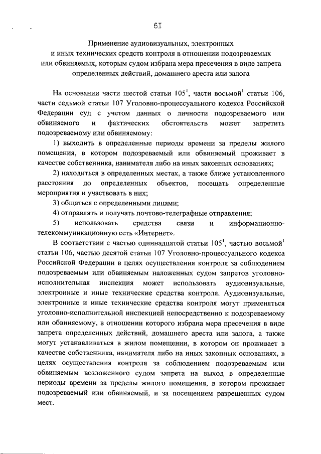"ОБ УТВЕРЖДЕНИИ ПОРЯДКА ОСУЩЕСТВЛЕНИЯ КОНТРОЛЯ ЗА НАХОЖДЕНИЕМ ПОДОЗРЕВАЕМЫХ ИЛИ ОБВИНЯЕМЫХ В МЕСТЕ ИСПОЛНЕНИЯ МЕРЫ ПРЕСЕЧЕНИЯ В ВИДЕ ДОМАШНЕГО АРЕСТА И ЗА СОБЛЮДЕНИЕМ ВОЗЛОЖЕННЫХ СУДОМ ЗАПРЕТОВ ПОДОЗРЕВАЕМЫМИ ИЛИ ОБВИНЯЕМЫМИ, В ОТНОШЕНИИ КОТОРЫХ В КАЧЕСТВЕ МЕРЫ ПРЕСЕЧЕНИЯ ИЗБРАН ЗАПРЕТ ОПРЕДЕЛЕННЫХ ДЕЙСТВИЙ, ДОМАШНИЙ АРЕСТ ИЛИ ЗАЛОГ"