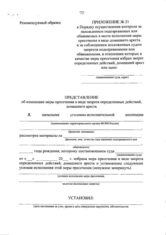 "ОБ УТВЕРЖДЕНИИ ПОРЯДКА ОСУЩЕСТВЛЕНИЯ КОНТРОЛЯ ЗА НАХОЖДЕНИЕМ ПОДОЗРЕВАЕМЫХ ИЛИ ОБВИНЯЕМЫХ В МЕСТЕ ИСПОЛНЕНИЯ МЕРЫ ПРЕСЕЧЕНИЯ В ВИДЕ ДОМАШНЕГО АРЕСТА И ЗА СОБЛЮДЕНИЕМ ВОЗЛОЖЕННЫХ СУДОМ ЗАПРЕТОВ ПОДОЗРЕВАЕМЫМИ ИЛИ ОБВИНЯЕМЫМИ, В ОТНОШЕНИИ КОТОРЫХ В КАЧЕСТВЕ МЕРЫ ПРЕСЕЧЕНИЯ ИЗБРАН ЗАПРЕТ ОПРЕДЕЛЕННЫХ ДЕЙСТВИЙ, ДОМАШНИЙ АРЕСТ ИЛИ ЗАЛОГ"