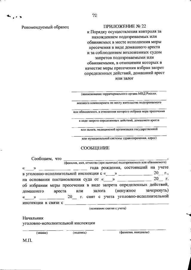 "ОБ УТВЕРЖДЕНИИ ПОРЯДКА ОСУЩЕСТВЛЕНИЯ КОНТРОЛЯ ЗА НАХОЖДЕНИЕМ ПОДОЗРЕВАЕМЫХ ИЛИ ОБВИНЯЕМЫХ В МЕСТЕ ИСПОЛНЕНИЯ МЕРЫ ПРЕСЕЧЕНИЯ В ВИДЕ ДОМАШНЕГО АРЕСТА И ЗА СОБЛЮДЕНИЕМ ВОЗЛОЖЕННЫХ СУДОМ ЗАПРЕТОВ ПОДОЗРЕВАЕМЫМИ ИЛИ ОБВИНЯЕМЫМИ, В ОТНОШЕНИИ КОТОРЫХ В КАЧЕСТВЕ МЕРЫ ПРЕСЕЧЕНИЯ ИЗБРАН ЗАПРЕТ ОПРЕДЕЛЕННЫХ ДЕЙСТВИЙ, ДОМАШНИЙ АРЕСТ ИЛИ ЗАЛОГ"