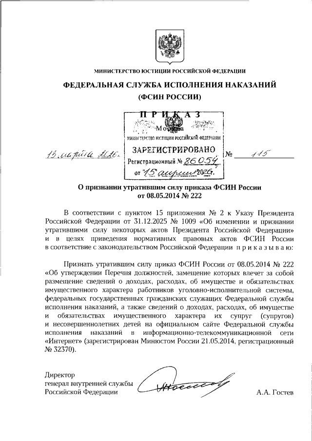 "О ПРИЗНАНИИ УТРАТИВШИМ СИЛУ ПРИКАЗА ФСИН РОССИИ ОТ 08.05.2014 N 222"