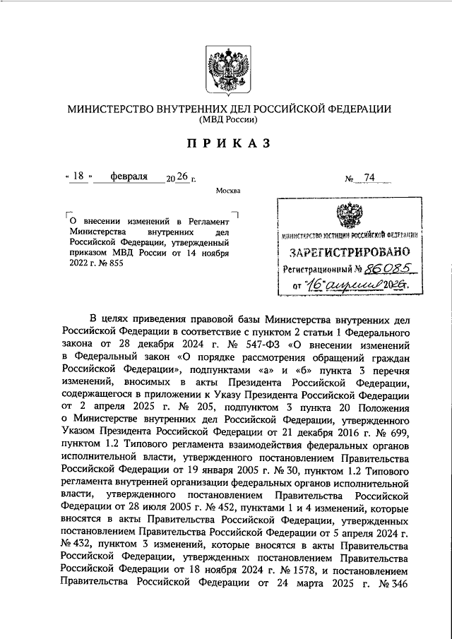 ПРИКАЗ МВД РФ от 18.02.2026 N 74