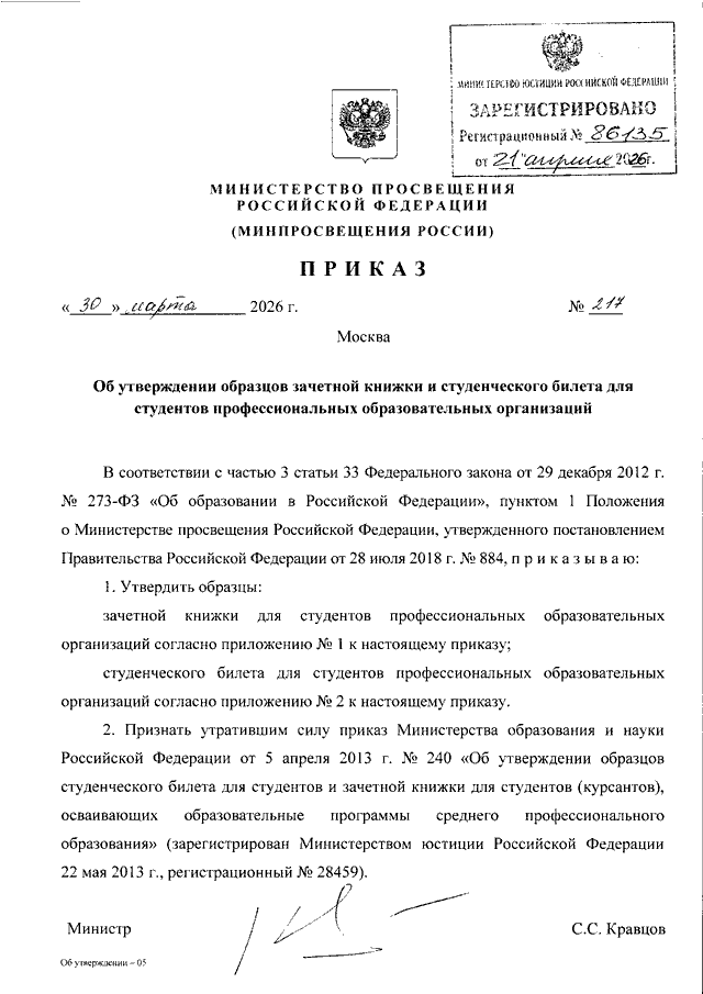 ПРИКАЗ Минпросвещения России от 30.03.2026 N 217