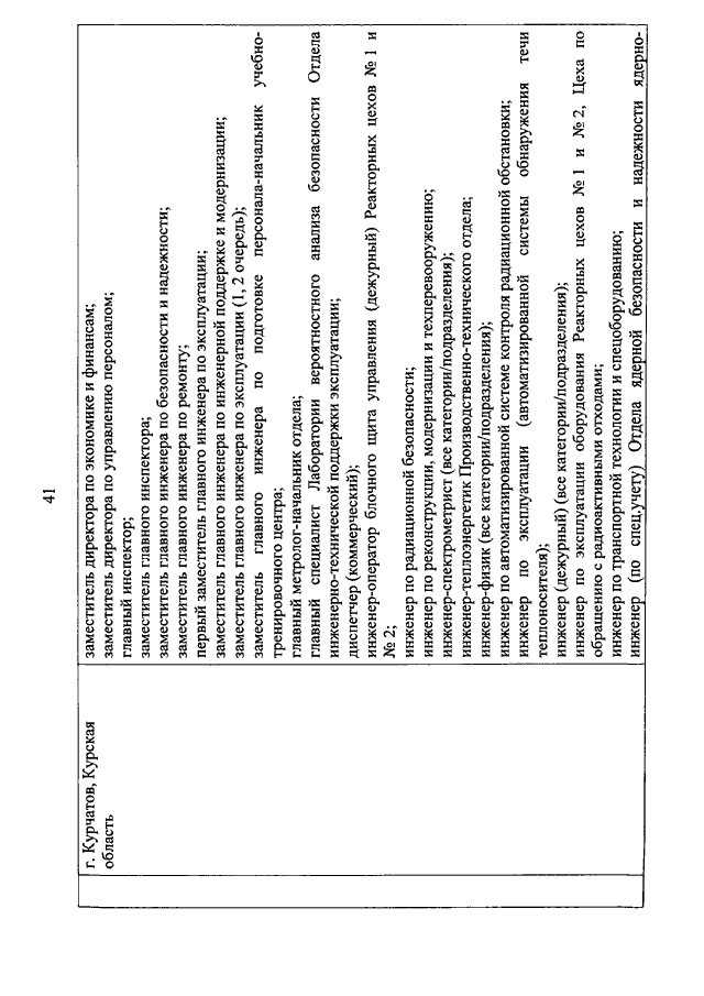 "Росатом" от 18.12.2013 N 1/21-НПА "ОБ УТВЕРЖДЕНИИ ПЕРЕЧНЯ ДОЛЖНОСТЕЙ (ПРОФЕССИЙ) РАБОТНИКОВ ЭКСПЛУАТИРУЮЩИХ ОРГАНИЗАЦИЙ, В ТОМ ЧИСЛЕ РАБОТНИКОВ, НЕПОСРЕДСТВЕННО ОБЕСПЕЧИВАЮЩИХ БЕЗОПАСНОСТЬ ОСОБО РАДИАЦИОННО ОПАСНЫХ И ЯДЕРНО ОПАСНЫХ ПРОИЗВОДСТВ И ОБЪЕКТОВ В ОБЛАСТИ ИСПОЛЬЗОВАНИЯ АТОМНОЙ ЭНЕРГИИ"