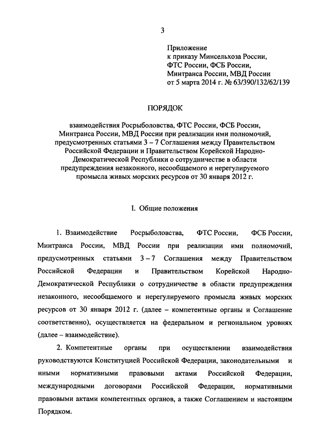 "ОБ УТВЕРЖДЕНИИ ПОРЯДКА ВЗАИМОДЕЙСТВИЯ РОСРЫБОЛОВСТВА, ФТС РОССИИ, ФСБ РОССИИ, МИНТРАНСА РОССИИ, МВД РОССИИ ПРИ РЕАЛИЗАЦИИ ИМИ ПОЛНОМОЧИЙ, ПРЕДУСМОТРЕННЫХ СТАТЬЯМИ 3 - 7 СОГЛАШЕНИЯ МЕЖДУ ПРАВИТЕЛЬСТВОМ РОССИЙСКОЙ ФЕДЕРАЦИИ И ПРАВИТЕЛЬСТВОМ КОРЕЙСКОЙ НАРОДНО - ДЕМОКРАТИЧЕСКОЙ РЕСПУБЛИКИ О СОТРУДНИЧЕСТВЕ В ОБЛАСТИ ПРЕДУПРЕЖДЕНИЯ НЕЗАКОННОГО, НЕСООБЩАЕМОГО И НЕРЕГУЛИРУЕМОГО ПРОМЫСЛА ЖИВЫХ МОРСКИХ РЕСУРСОВ ОТ 30 ЯНВАРЯ 2012 Г."