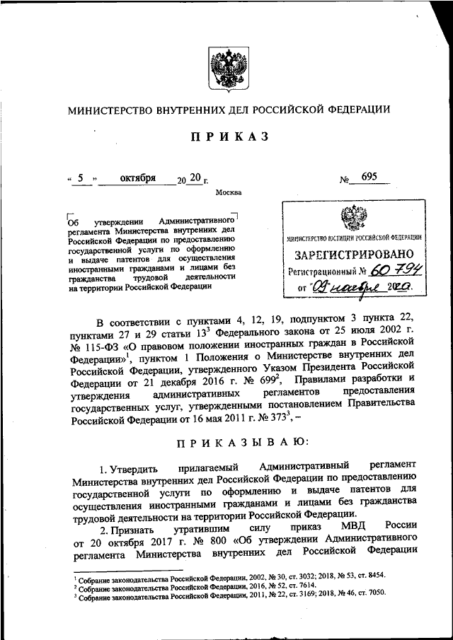 ПРИКАЗ МВД РФ от 05.10.2020 N 695