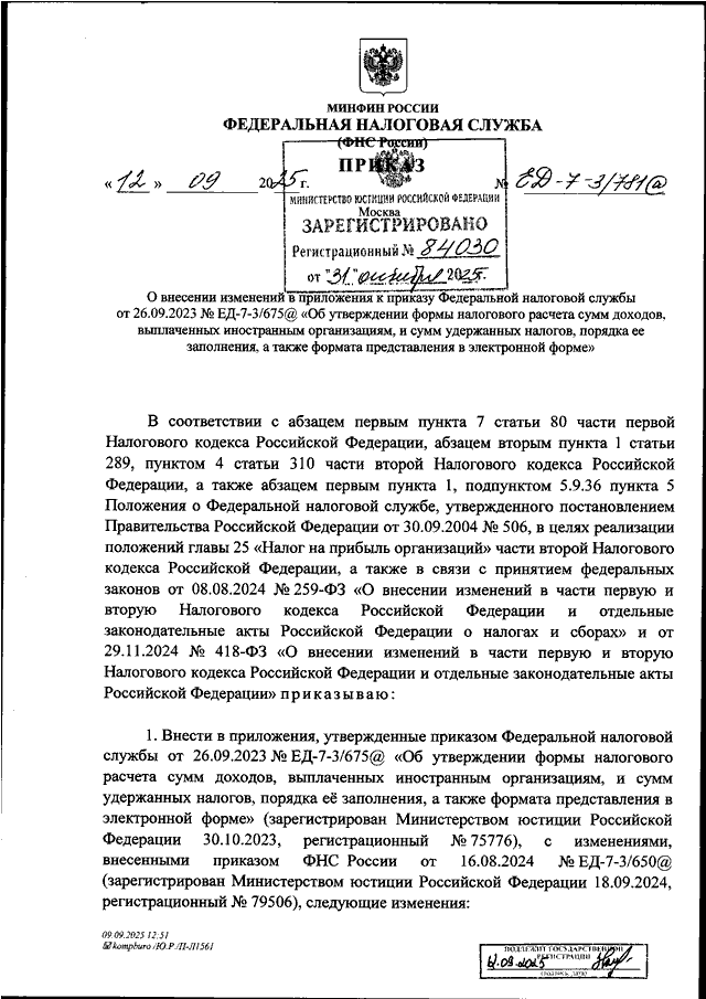 "О ВНЕСЕНИИ ИЗМЕНЕНИЙ В ПРИЛОЖЕНИЯ К ПРИКАЗУ ФЕДЕРАЛЬНОЙ НАЛОГОВОЙ СЛУЖБЫ ОТ 26.09.2023 N ЕД-7-3/675@ "ОБ УТВЕРЖДЕНИИ ФОРМЫ НАЛОГОВОГО РАСЧЕТА СУММ ДОХОДОВ, ВЫПЛАЧЕННЫХ ИНОСТРАННЫМ ОРГАНИЗАЦИЯМ, И СУММ УДЕРЖАННЫХ НАЛОГОВ, ПОРЯДКА ЕЕ ЗАПОЛНЕНИЯ, А ТАКЖЕ ФОРМАТА ПРЕДСТАВЛЕНИЯ В ЭЛЕКТРОННОЙ ФОРМЕ"