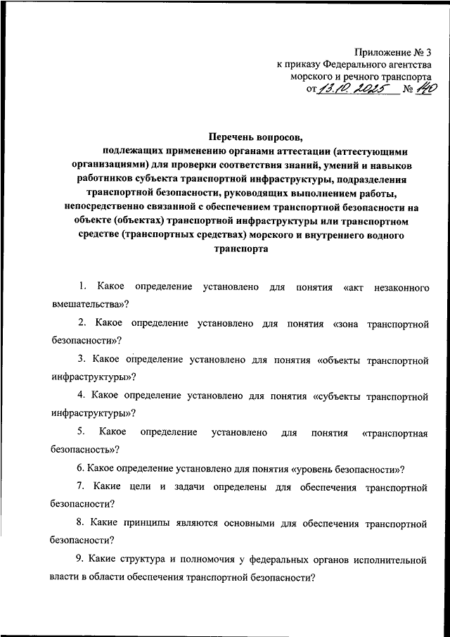 "ОБ УТВЕРЖДЕНИИ ПЕРЕЧНЕЙ ВОПРОСОВ, ПОДЛЕЖАЩИХ ПРИМЕНЕНИЮ ОРГАНАМИ АТТЕСТАЦИИ (АТТЕСТУЮЩИМИ ОРГАНИЗАЦИЯМИ) ДЛЯ ПРОВЕРКИ СООТВЕТСТВИЯ ЗНАНИЙ, УМЕНИЙ И НАВЫКОВ АТТЕСТУЕМЫХ ЛИЦ ТРЕБОВАНИЯМ ЗАКОНОДАТЕЛЬСТВА РОССИЙСКОЙ ФЕДЕРАЦИИ О ТРАНСПОРТНОЙ БЕЗОПАСНОСТИ ПРИ ПРОВЕДЕНИИ АТТЕСТАЦИИ СИЛ ОБЕСПЕЧЕНИЯ ТРАНСПОРТНОЙ БЕЗОПАСНОСТИ НА МОРСКОМ И ВНУТРЕННЕМ ВОДНОМ ТРАНСПОРТЕ"