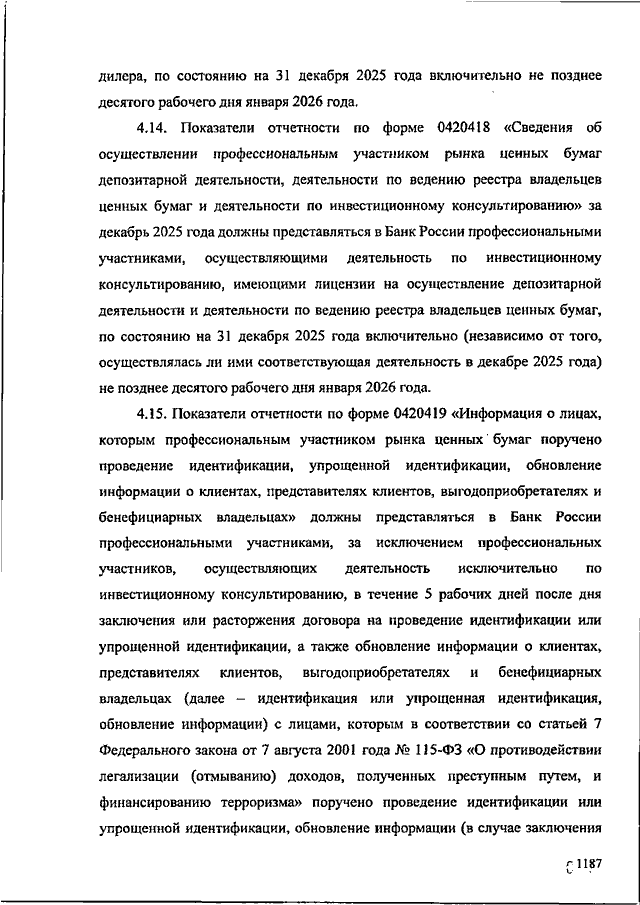 "О ФОРМАХ, СРОКАХ И ПОРЯДКЕ СОСТАВЛЕНИЯ И ПРЕДСТАВЛЕНИЯ В БАНК РОССИИ ОТЧЕТНОСТИ ПРОФЕССИОНАЛЬНЫХ УЧАСТНИКОВ РЫНКА ЦЕННЫХ БУМАГ, ОБ ОБЪЕМЕ, ФОРМАХ, СРОКАХ И ПОРЯДКЕ СОСТАВЛЕНИЯ И ПРЕДСТАВЛЕНИЯ В БАНК РОССИИ ОТЧЕТОВ ОРГАНИЗАТОРОВ ТОРГОВЛИ И КЛИРИНГОВЫХ ОРГАНИЗАЦИЙ, А ТАКЖЕ О ПОРЯДКЕ СООБЩЕНИЯ ПРОФЕССИОНАЛЬНЫМИ УЧАСТНИКАМИ РЫНКА ЦЕННЫХ БУМАГ БАНКУ РОССИИ ИНФОРМАЦИИ О ЛИЦАХ, КОТОРЫМ ПОРУЧЕНО ПРОВЕДЕНИЕ ИДЕНТИФИКАЦИИ, УПРОЩЕННОЙ ИДЕНТИФИКАЦИИ, ОБНОВЛЕНИЕ ИНФОРМАЦИИ О КЛИЕНТАХ, ПРЕДСТАВИТЕЛЯХ КЛИЕНТОВ, ВЫГОДОПРЕОБРЕТАТЕЛЯХ И БЕНЕФИЦИАРНЫХ ВЛАДЕЛЬЦАХ"