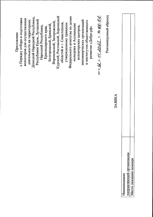 "ОБ УТВЕРЖДЕНИИ ПОРЯДКА ОТБОРА И ПОДГОТОВКИ ВОЛОНТЕРОВ ДЛЯ ОСУЩЕСТВЛЕНИЯ ДЕЯТЕЛЬНОСТИ НА ТЕРРИТОРИЯХ ДОНЕЦКОЙ НАРОДНОЙ РЕСПУБЛИКИ, РЕСПУБЛИКИ КРЫМ, ЛУГАНСКОЙ НАРОДНОЙ РЕСПУБЛИКИ, КРАСНОДАРСКОГО КРАЯ, БЕЛГОРОДСКОЙ, БРЯНСКОЙ, ВОРОНЕЖСКОЙ, ЗАПОРОЖСКОЙ, КУРСКОЙ, РОСТОВСКОЙ, ХЕРСОНСКОЙ ОБЛАСТЕЙ И Г. СЕВАСТОПОЛЯ"