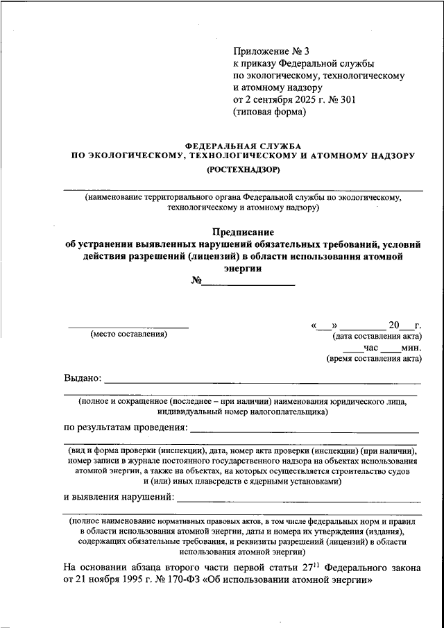 ПРИКАЗ Ростехнадзора от 02.09.2025 N 301