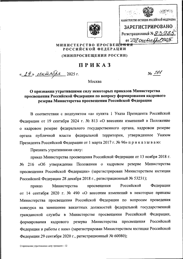 "О ПРИЗНАНИИ УТРАТИВШИМИ СИЛУ НЕКОТОРЫХ ПРИКАЗОВ МИНИСТЕРСТВА ПРОСВЕЩЕНИЯ РОССИЙСКОЙ ФЕДЕРАЦИИ ПО ВОПРОСУ ФОРМИРОВАНИЯ КАДРОВОГО РЕЗЕРВА МИНИСТЕРСТВА ПРОСВЕЩЕНИЯ РОССИЙСКОЙ ФЕДЕРАЦИИ"