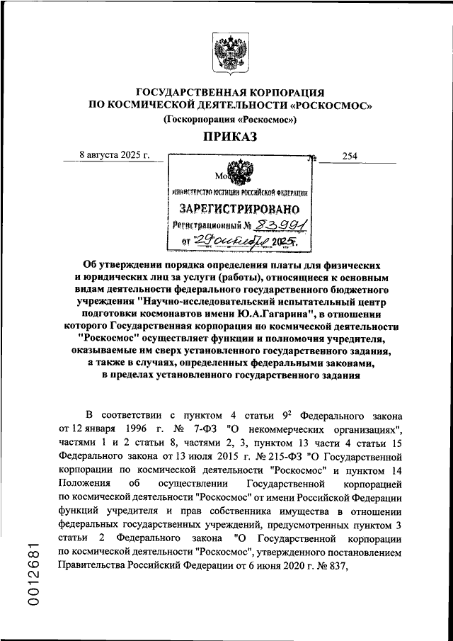 "Роскосмос" от 08.08.2025 N 254 "ОБ УТВЕРЖДЕНИИ ПОРЯДКА ОПРЕДЕЛЕНИЯ ПЛАТЫ ДЛЯ ФИЗИЧЕСКИХ И ЮРИДИЧЕСКИХ ЛИЦ ЗА УСЛУГИ (РАБОТЫ), ОТНОСЯЩИЕСЯ К ОСНОВНЫМ ВИДАМ ДЕЯТЕЛЬНОСТИ ФЕДЕРАЛЬНОГО ГОСУДАРСТВЕННОГО БЮДЖЕТНОГО УЧРЕЖДЕНИЯ "НАУЧНО - ИССЛЕДОВАТЕЛЬСКИЙ ИСПЫТАТЕЛЬНЫЙ ЦЕНТР ПОДГОТОВКИ КОСМОНАВТОВ ИМЕНИ Ю.А.ГАГАРИНА", В ОТНОШЕНИИ КОТОРОГО ГОСУДАРСТВЕННАЯ КОРПОРАЦИЯ ПО КОСМИЧЕСКОЙ ДЕЯТЕЛЬНОСТИ "РОСКОСМОС" ОСУЩЕСТВЛЯЕТ ФУНКЦИИ И ПОЛНОМОЧИЯ УЧРЕДИТЕЛЯ, ОКАЗЫВАЕМЫЕ ИМ СВЕРХ УСТАНОВЛЕННОГО ГОСУДАРСТВЕННОГО ЗАДАНИЯ, А ТАКЖЕ В СЛУЧАЯХ, ОПРЕДЕЛЕННЫХ ФЕДЕРАЛЬНЫМИ ЗАКОНАМИ, В ПРЕДЕЛАХ УСТАНОВЛЕННОГО ГОСУДАРСТВЕННОГО ЗАДАНИЯ"
