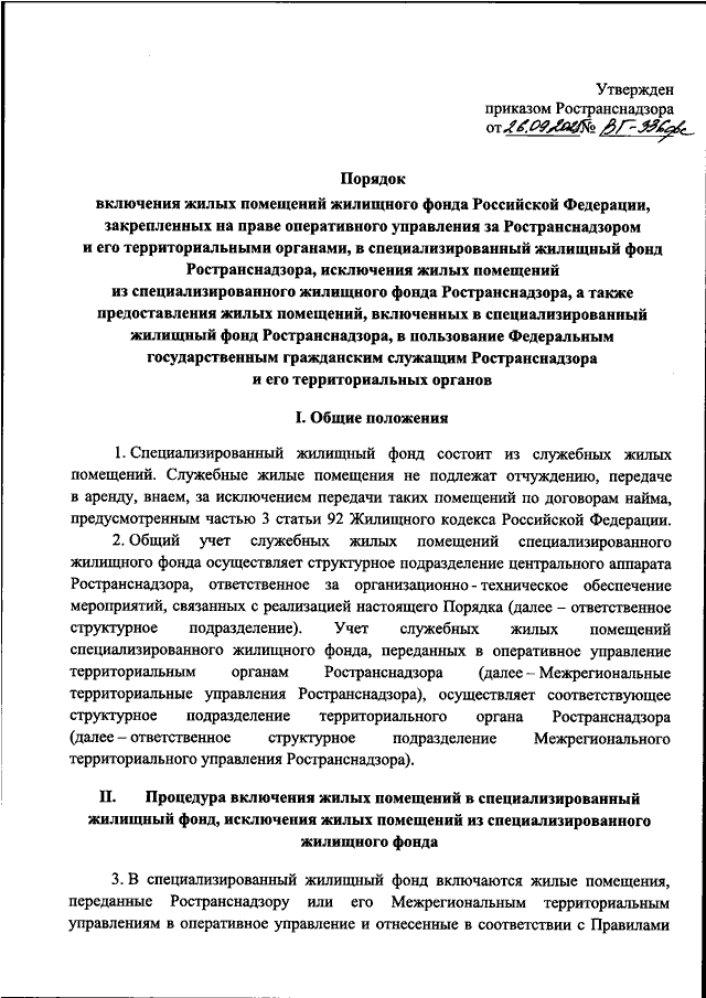"ОБ УТВЕРЖДЕНИИ ПОРЯДКА ВКЛЮЧЕНИЯ ЖИЛЫХ ПОМЕЩЕНИЙ ЖИЛИЩНОГО ФОНДА РОССИЙСКОЙ ФЕДЕРАЦИИ, ЗАКРЕПЛЕННЫХ НА ПРАВЕ ОПЕРАТИВНОГО УПРАВЛЕНИЯ ЗА РОСТРАНСНАДЗОРОМ И ЕГО ТЕРРИТОРИАЛЬНЫМИ ОРГАНАМИ, В СПЕЦИАЛИЗИРОВАННЫЙ ЖИЛИЩНЫЙ ФОНД РОСТРАНСНАДЗОРА, ИСКЛЮЧЕНИЯ ЖИЛЫХ ПОМЕЩЕНИЙ ИЗ СПЕЦИАЛИЗИРОВАННОГО ЖИЛИЩНОГО ФОНДА РОСТРАНСНАДЗОРА, А ТАКЖЕ ПРЕДОСТАВЛЕНИЯ ЖИЛЫХ ПОМЕЩЕНИЙ, ВКЛЮЧЕННЫХ В СПЕЦИАЛИЗИРОВАННЫЙ ЖИЛИЩНЫЙ ФОНД РОСТРАНСНАДЗОРА, В ПОЛЬЗОВАНИЕ ФЕДЕРАЛЬНЫМ ГОСУДАРСТВЕННЫМ ГРАЖДАНСКИМ СЛУЖАЩИМ РОСТРАНСНАДЗОРА И ЕГО ТЕРРИТОРИАЛЬНЫХ ОРГАНОВ"