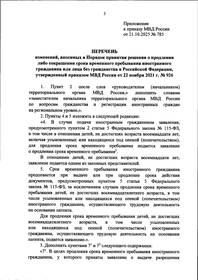 "О ВНЕСЕНИИ ИЗМЕНЕНИЙ В ПОРЯДОК ПРИНЯТИЯ РЕШЕНИЯ О ПРОДЛЕНИИ ЛИБО СОКРАЩЕНИИ СРОКА ВРЕМЕННОГО ПРЕБЫВАНИЯ ИНОСТРАННОГО ГРАЖДАНИНА ИЛИ ЛИЦА БЕЗ ГРАЖДАНСТВА В РОССИЙСКОЙ ФЕДЕРАЦИИ, УТВЕРЖДЕННЫЙ ПРИКАЗОМ МВД РОССИИ ОТ 22 НОЯБРЯ 2021 Г. N 926"