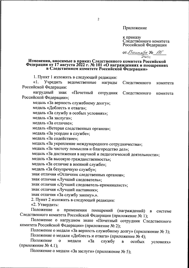 "О ВНЕСЕНИИ ИЗМЕНЕНИЙ В ПРИКАЗ СЛЕДСТВЕННОГО КОМИТЕТА РОССИЙСКОЙ ФЕДЕРАЦИИ ОТ 17 АВГУСТА 2022 Г. N 101 "О НАГРАЖДЕНИЯХ И ПООЩРЕНИЯХ В СЛЕДСТВЕННОМ КОМИТЕТЕ РОССИЙСКОЙ ФЕДЕРАЦИИ"