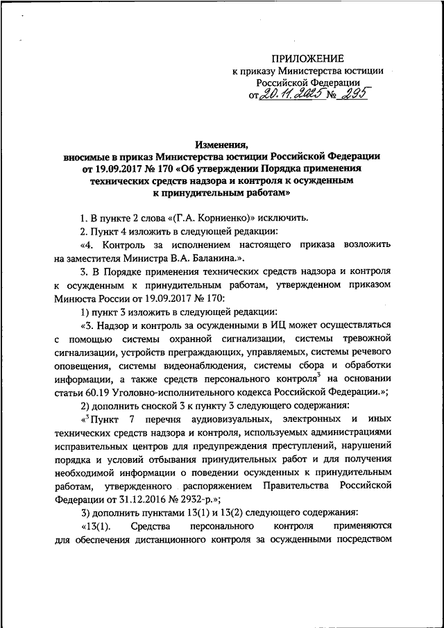 "О ВНЕСЕНИИ ИЗМЕНЕНИЙ В ПРИКАЗ МИНИСТЕРСТВА ЮСТИЦИИ РОССИЙСКОЙ ФЕДЕРАЦИИ ОТ 19.09.2017 N 170 "ОБ УТВЕРЖДЕНИИ ПОРЯДКА ПРИМЕНЕНИЯ ТЕХНИЧЕСКИХ СРЕДСТВ НАДЗОРА И КОНТРОЛЯ К ОСУЖДЕННЫМ К ПРИНУДИТЕЛЬНЫМ РАБОТАМ"