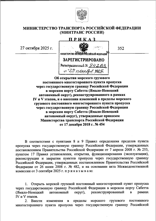 "ОБ ОТКРЫТИИ МОРСКОГО ГРУЗОВОГО ПОСТОЯННОГО МНОГОСТОРОННЕГО ПУНКТА ПРОПУСКА ЧЕРЕЗ ГОСУДАРСТВЕННУЮ ГРАНИЦУ РОССИЙСКОЙ ФЕДЕРАЦИИ В МОРСКОМ ПОРТУ САБЕТТА (ЯМАЛО - НЕНЕЦКИЙ АВТОНОМНЫЙ ОКРУГ), РЕКОНСТРУИРОВАННОГО В РАМКАХ IV И V ЭТАПОВ, И О ВНЕСЕНИИ ИЗМЕНЕНИЙ В ПРЕДЕЛЫ МОРСКОГО ГРУЗОВОГО ПОСТОЯННОГО МНОГОСТОРОННЕГО ПУНКТА ПРОПУСКА ЧЕРЕЗ ГОСУДАРСТВЕННУЮ ГРАНИЦУ РОССИЙСКОЙ ФЕДЕРАЦИИ В МОРСКОМ ПОРТУ САБЕТТА (ЯМАЛО - НЕНЕЦКИЙ АВТОНОМНЫЙ ОКРУГ), УТВЕРЖДЕННЫЕ ПРИКАЗОМ МИНИСТЕРСТВА ТРАНСПОРТА РОССИЙСКОЙ ФЕДЕРАЦИИ ОТ 17 ДЕКАБРЯ 2018 Г. N 454"