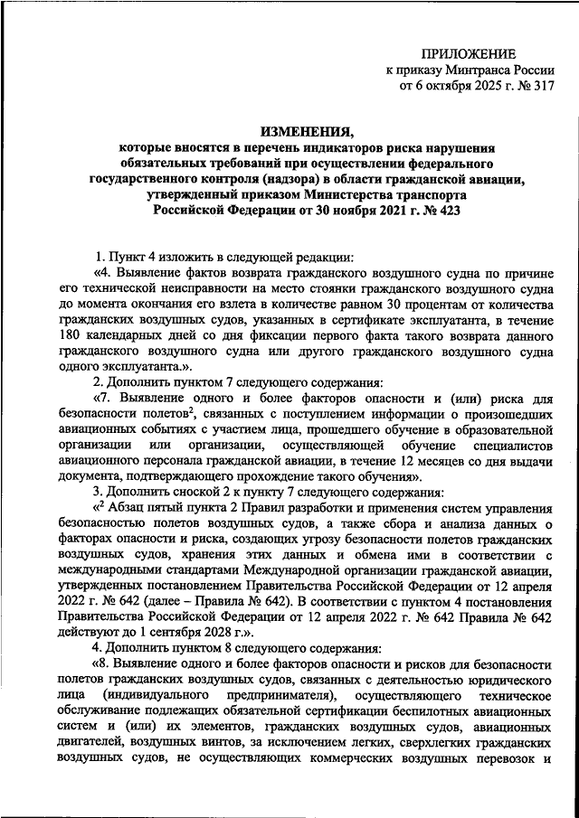 "О ВНЕСЕНИИ ИЗМЕНЕНИЙ В ПЕРЕЧЕНЬ ИНДИКАТОРОВ РИСКА НАРУШЕНИЯ ОБЯЗАТЕЛЬНЫХ ТРЕБОВАНИЙ ПРИ ОСУЩЕСТВЛЕНИИ ФЕДЕРАЛЬНОГО ГОСУДАРСТВЕННОГО КОНТРОЛЯ (НАДЗОРА) В ОБЛАСТИ ГРАЖДАНСКОЙ АВИАЦИИ, УТВЕРЖДЕННЫЙ ПРИКАЗОМ МИНИСТЕРСТВА ТРАНСПОРТА РОССИЙСКОЙ ФЕДЕРАЦИИ ОТ 30 НОЯБРЯ 2021 Г. N 423"