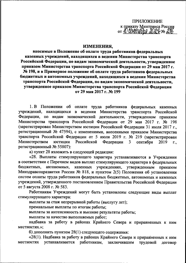"О ВНЕСЕНИИ ИЗМЕНЕНИЙ В ПОЛОЖЕНИЕ ОБ ОПЛАТЕ ТРУДА РАБОТНИКОВ ФЕДЕРАЛЬНЫХ КАЗЕННЫХ УЧРЕЖДЕНИЙ, НАХОДЯЩИХСЯ В ВЕДЕНИИ МИНИСТЕРСТВА ТРАНСПОРТА РОССИЙСКОЙ ФЕДЕРАЦИИ, ПО ВИДАМ ЭКОНОМИЧЕСКОЙ ДЕЯТЕЛЬНОСТИ, УТВЕРЖДЕННОЕ ПРИКАЗОМ МИНИСТЕРСТВА ТРАНСПОРТА РОССИЙСКОЙ ФЕДЕРАЦИИ ОТ 29 МАЯ 2017 Г. N 198, И В ПРИМЕРНОЕ ПОЛОЖЕНИЕ ОБ ОПЛАТЕ ТРУДА РАБОТНИКОВ ФЕДЕРАЛЬНЫХ БЮДЖЕТНЫХ И АВТОНОМНЫХ УЧРЕЖДЕНИЙ, НАХОДЯЩИХСЯ В ВЕДЕНИИ МИНИСТЕРСТВА ТРАНСПОРТА РОССИЙСКОЙ ФЕДЕРАЦИИ, ПО ВИДАМ ЭКОНОМИЧЕСКОЙ ДЕЯТЕЛЬНОСТИ, УТВЕРЖДЕННОЕ ПРИКАЗОМ МИНИСТЕРСТВА ТРАНСПОРТА РОССИЙСКОЙ ФЕДЕРАЦИИ ОТ 29 МАЯ 2017 Г. N 199"