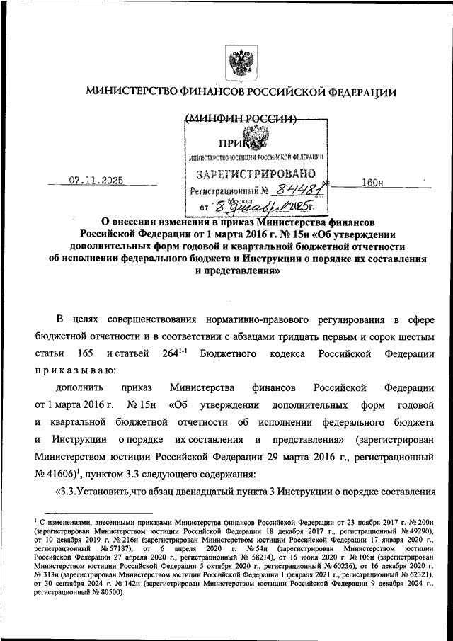 ПРИКАЗ Минфина РФ от 07.11.2025 N 160н