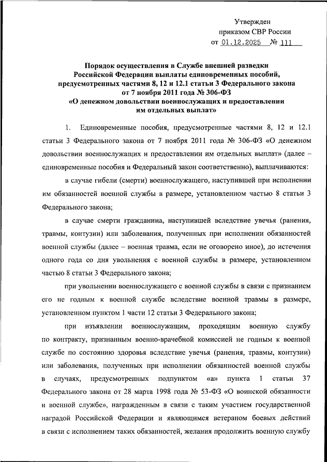 ПРИКАЗ СВР РФ от 01.12.2025 N 111