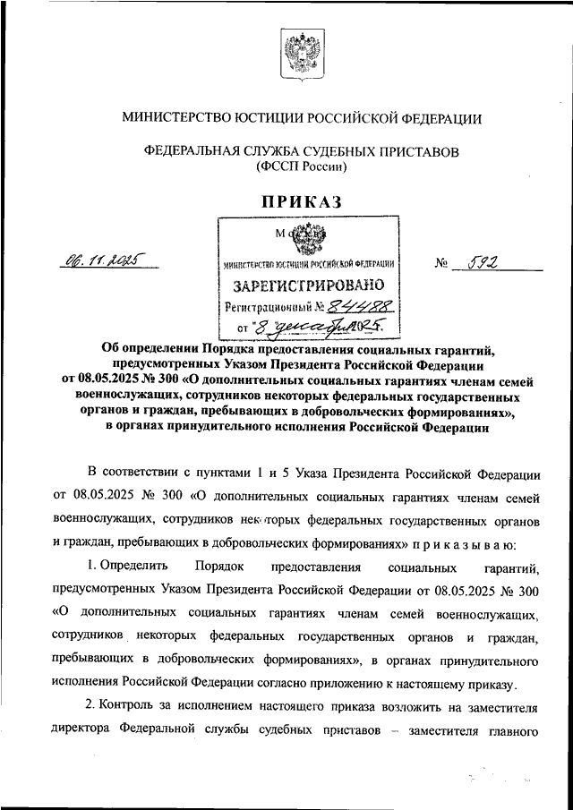 "ОБ ОПРЕДЕЛЕНИИ ПОРЯДКА ПРЕДОСТАВЛЕНИЯ СОЦИАЛЬНЫХ ГАРАНТИЙ, ПРЕДУСМОТРЕННЫХ УКАЗОМ ПРЕЗИДЕНТА РОССИЙСКОЙ ФЕДЕРАЦИИ ОТ 08.05.2025 N 300 "О ДОПОЛНИТЕЛЬНЫХ СОЦИАЛЬНЫХ ГАРАНТИЯХ ЧЛЕНАМ СЕМЕЙ ВОЕННОСЛУЖАЩИХ, СОТРУДНИКОВ НЕКОТОРЫХ ФЕДЕРАЛЬНЫХ ГОСУДАРСТВЕННЫХ ОРГАНОВ И ГРАЖДАН, ПРЕБЫВАЮЩИХ В ДОБРОВОЛЬЧЕСКИХ ФОРМИРОВАНИЯХ", В ОРГАНАХ ПРИНУДИТЕЛЬНОГО ИСПОЛНЕНИЯ РОССИЙСКОЙ ФЕДЕРАЦИИ"