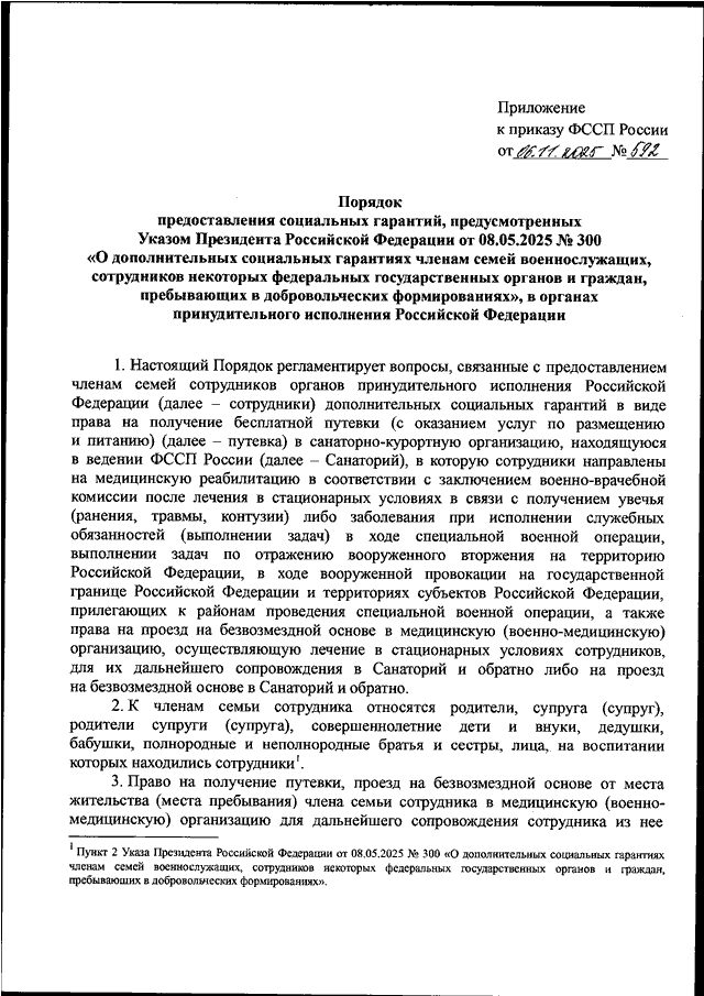 "ОБ ОПРЕДЕЛЕНИИ ПОРЯДКА ПРЕДОСТАВЛЕНИЯ СОЦИАЛЬНЫХ ГАРАНТИЙ, ПРЕДУСМОТРЕННЫХ УКАЗОМ ПРЕЗИДЕНТА РОССИЙСКОЙ ФЕДЕРАЦИИ ОТ 08.05.2025 N 300 "О ДОПОЛНИТЕЛЬНЫХ СОЦИАЛЬНЫХ ГАРАНТИЯХ ЧЛЕНАМ СЕМЕЙ ВОЕННОСЛУЖАЩИХ, СОТРУДНИКОВ НЕКОТОРЫХ ФЕДЕРАЛЬНЫХ ГОСУДАРСТВЕННЫХ ОРГАНОВ И ГРАЖДАН, ПРЕБЫВАЮЩИХ В ДОБРОВОЛЬЧЕСКИХ ФОРМИРОВАНИЯХ", В ОРГАНАХ ПРИНУДИТЕЛЬНОГО ИСПОЛНЕНИЯ РОССИЙСКОЙ ФЕДЕРАЦИИ"