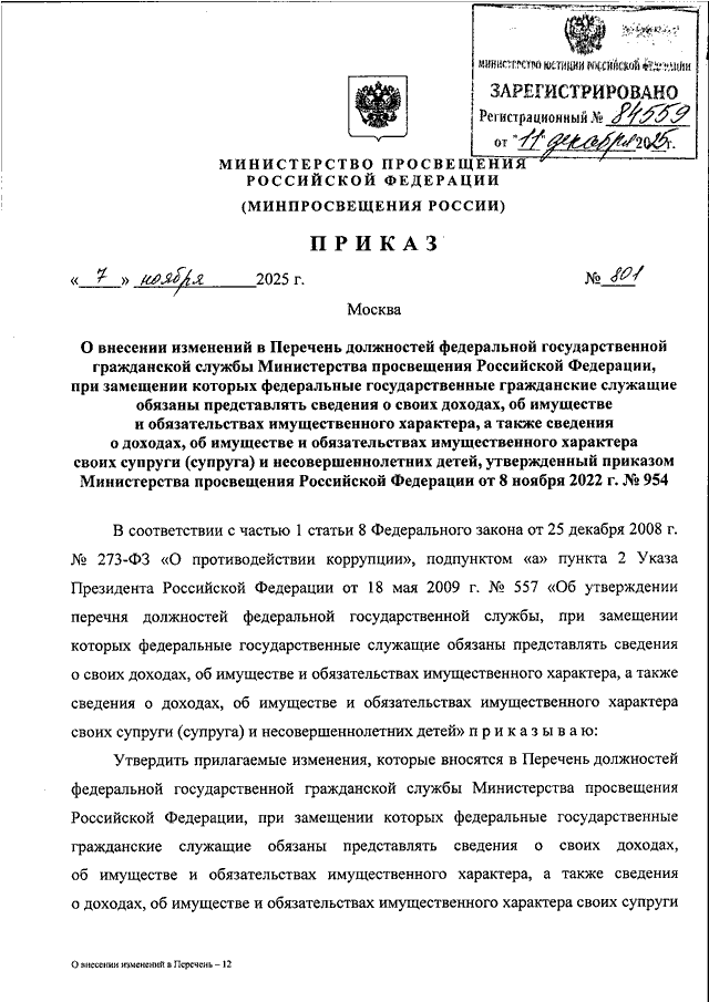 ПРИКАЗ Минпросвещения России от 07.11.2025 N 801