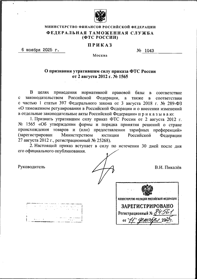 ПРИКАЗ ФТС РФ от 06.11.2025 N 1043