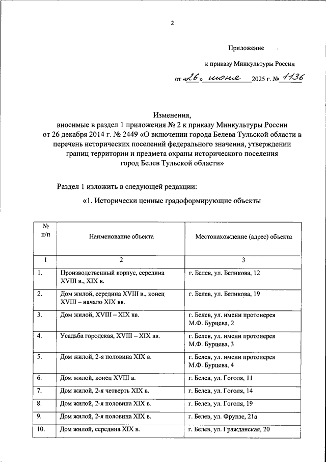 "О ВНЕСЕНИИ ИЗМЕНЕНИЙ В РАЗДЕЛ 1 ПРИЛОЖЕНИЯ N 2 К ПРИКАЗУ МИНИСТЕРСТВА КУЛЬТУРЫ РОССИЙСКОЙ ФЕДЕРАЦИИ ОТ 26 ДЕКАБРЯ 2014 Г. N 2449 "О ВКЛЮЧЕНИИ ГОРОДА БЕЛЕВА ТУЛЬСКОЙ ОБЛАСТИ В ПЕРЕЧЕНЬ ИСТОРИЧЕСКИХ ПОСЕЛЕНИЙ ФЕДЕРАЛЬНОГО ЗНАЧЕНИЯ, УТВЕРЖДЕНИИ ГРАНИЦ ТЕРРИТОРИИ И ПРЕДМЕТА ОХРАНЫ ИСТОРИЧЕСКОГО ПОСЕЛЕНИЯ ГОРОД БЕЛЕВ ТУЛЬСКОЙ ОБЛАСТИ"
