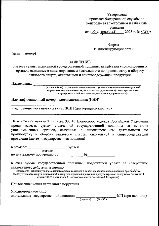 "ОБ УТВЕРЖДЕНИИ ФОРМЫ ЗАЯВЛЕНИЯ О ЗАЧЕТЕ СУММЫ УПЛАЧЕННОЙ ГОСУДАРСТВЕННОЙ ПОШЛИНЫ ЗА ДЕЙСТВИЯ УПОЛНОМОЧЕННЫХ ОРГАНОВ, СВЯЗАННЫЕ С ЛИЦЕНЗИРОВАНИЕМ ДЕЯТЕЛЬНОСТИ ПО ПРОИЗВОДСТВУ И ОБОРОТУ ЭТИЛОВОГО СПИРТА, АЛКОГОЛЬНОЙ И СПИРТОСОДЕРЖАЩЕЙ ПРОДУКЦИИ"