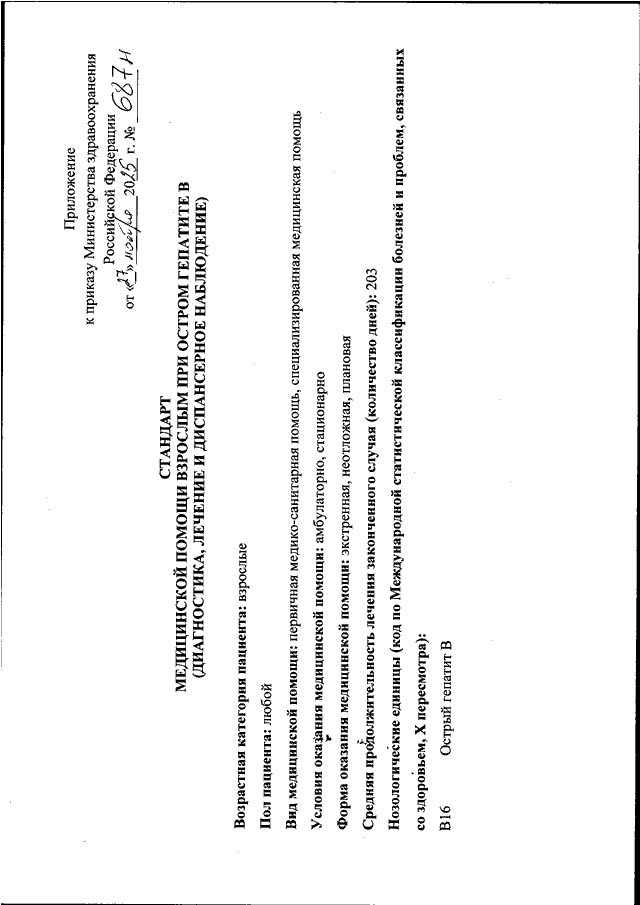 "ОБ УТВЕРЖДЕНИИ СТАНДАРТА МЕДИЦИНСКОЙ ПОМОЩИ ВЗРОСЛЫМ ПРИ ОСТРОМ ГЕПАТИТЕ В (ДИАГНОСТИКА, ЛЕЧЕНИЕ И ДИСПАНСЕРНОЕ НАБЛЮДЕНИЕ)"