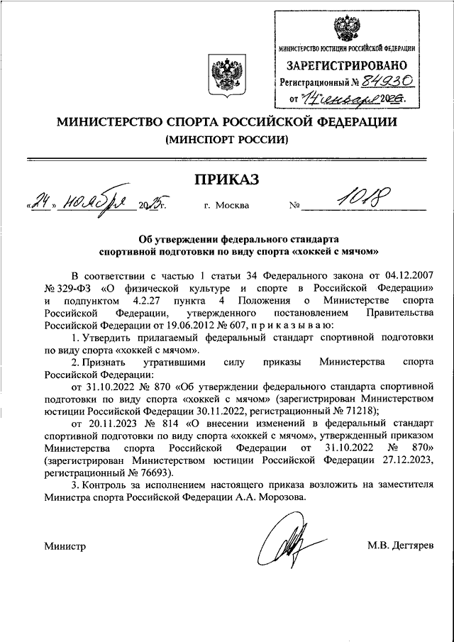 ПРИКАЗ Минспорта РФ от 24.11.2025 N 1018