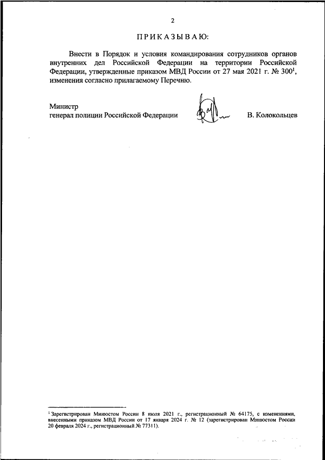 "О ВНЕСЕНИИ ИЗМЕНЕНИЙ В ПОРЯДОК И УСЛОВИЯ КОМАНДИРОВАНИЯ СОТРУДНИКОВ ОРГАНОВ ВНУТРЕННИХ ДЕЛ РОССИЙСКОЙ ФЕДЕРАЦИИ НА ТЕРРИТОРИИ РОССИЙСКОЙ ФЕДЕРАЦИИ, УТВЕРЖДЕННЫЕ ПРИКАЗОМ МВД РОССИИ ОТ 27 МАЯ 2021 Г. N 300"