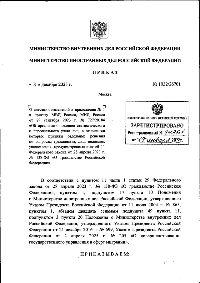 ПРИКАЗ МВД РФ N 1032, МИД РФ N 26701 от 08.12.2025